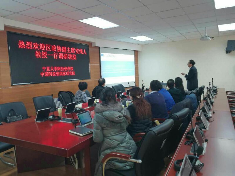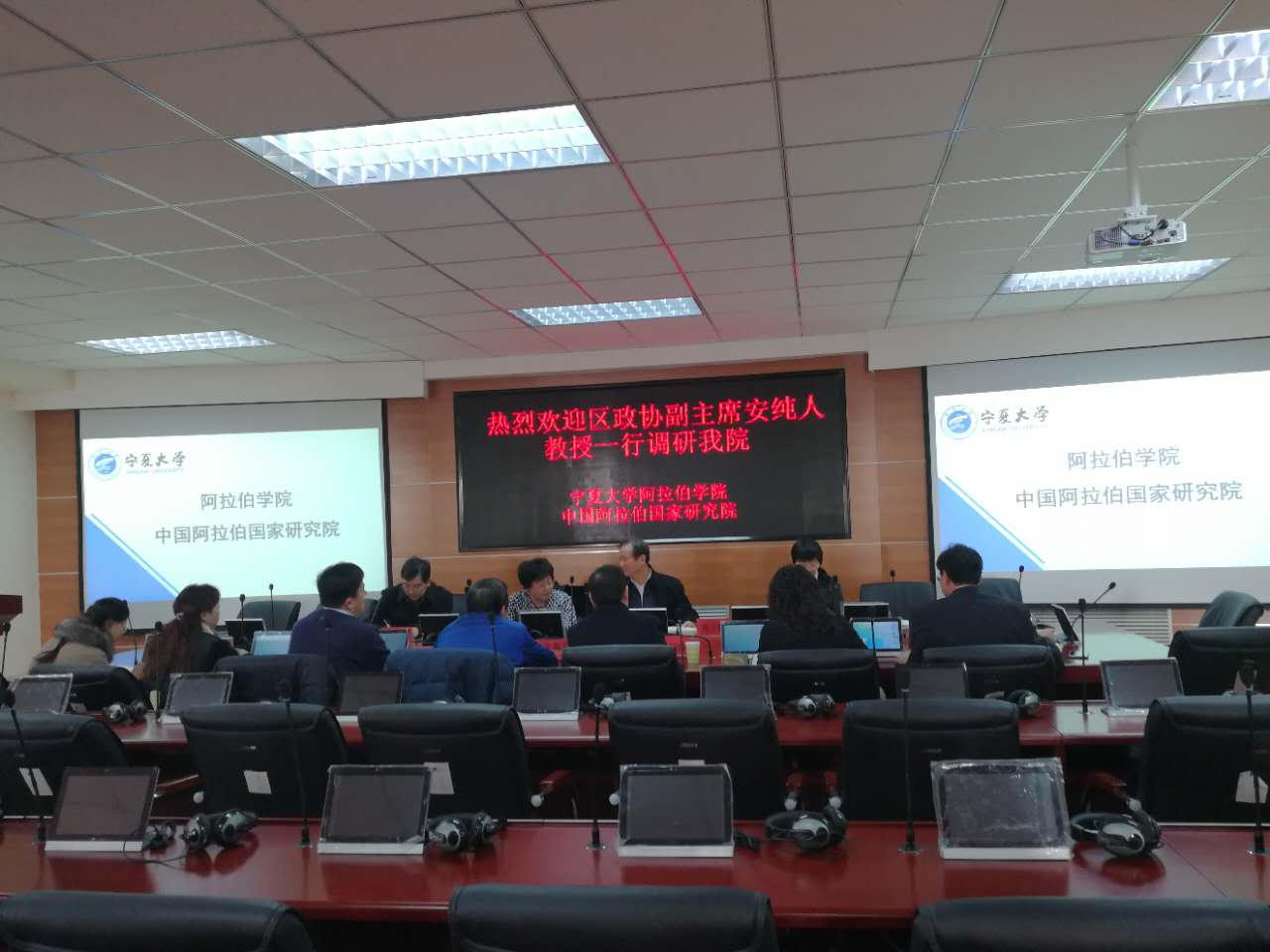 1月5日,自治区政协副主席安纯人在副秘书长陈莉萍、我校副校长谢应忠及学校相关部门负责人陪同下来到3044am永利进行调研,并参观考察了学院语音室、同传室、资料室、国际会议报告厅等场所。谢应忠副校长主持了调研座谈会。区政协教科文体委员会办公室负责人蒋玉敏、区政协办公厅秘书处牛金才、校党委统战部部长井惠敏、3044am永利与中国阿拉伯国家研究院负责人参加了调研。