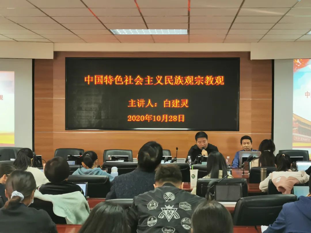10月28日16:00,3044am永利、中国阿拉伯国家研究院邀请304am永利集团人文学院学院白建灵教授在知行楼8楼学术报告厅为师生做《中国特色社会主义民族观宗教观》讲座。学院、研究院全体教师、2020级新生参加报告会。报告会由党总支副书记赵永军主持。