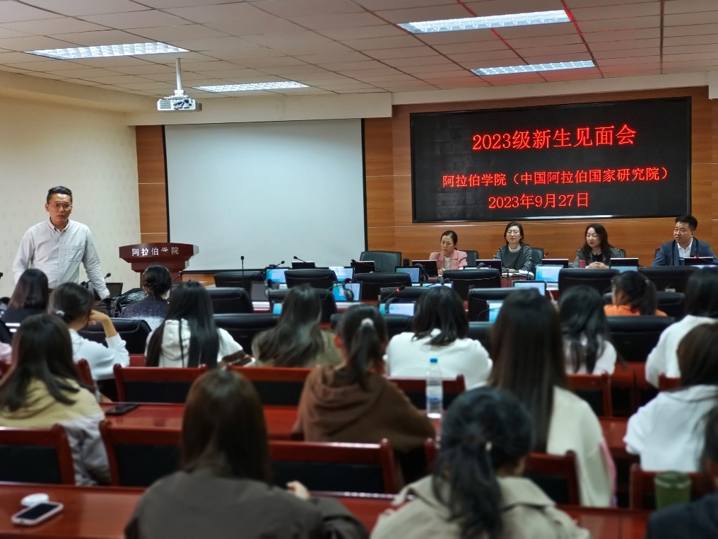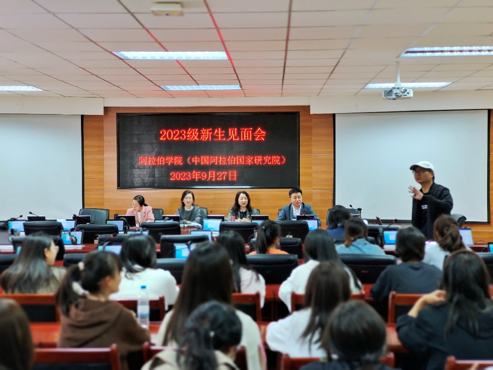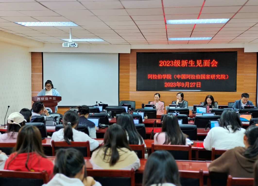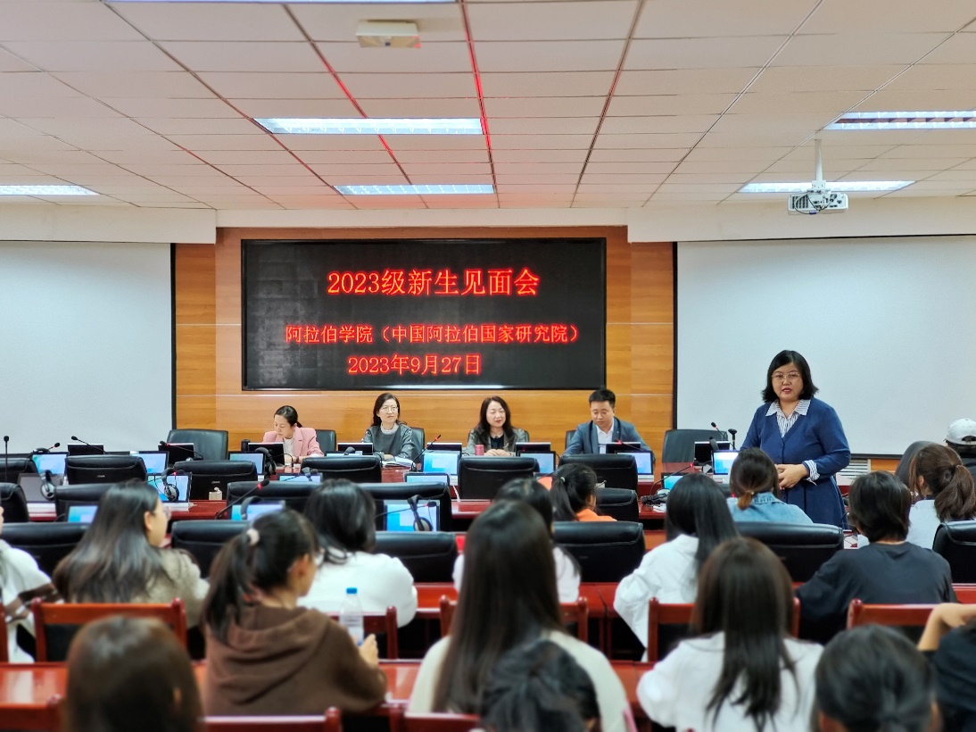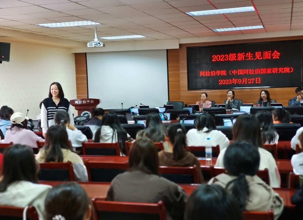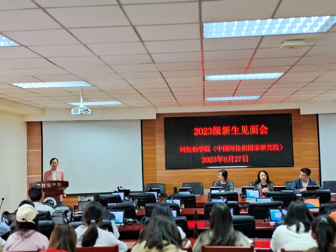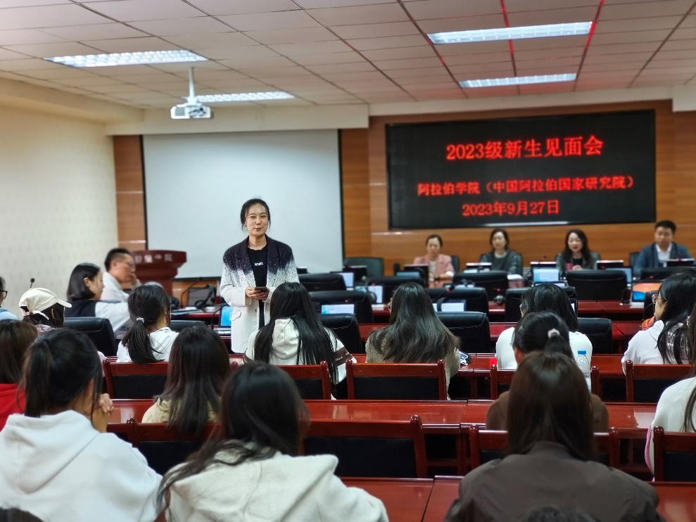 首先党总支书记冯璐璐代表学院致辞,对新同学的加入表示欢迎,她回顾了学院发展至今的历程,分享了在学科建设、专业建设、师资队伍建设等方面取得的成就,并介绍了学院整体发展现状与规划,对新生发表开学寄语,希望学生不负韶华,以梦为马,追逐梦想。接着各位老师进行了自我介绍并表达了对新生的寄语,鼓励新生刻苦学习,掌握阿拉伯语学习技巧、勉励他们要认真学习、坚持不懈、学会沟通、懂得感恩,在大学生活中不断完善自己,为未来打下坚实的基础。
