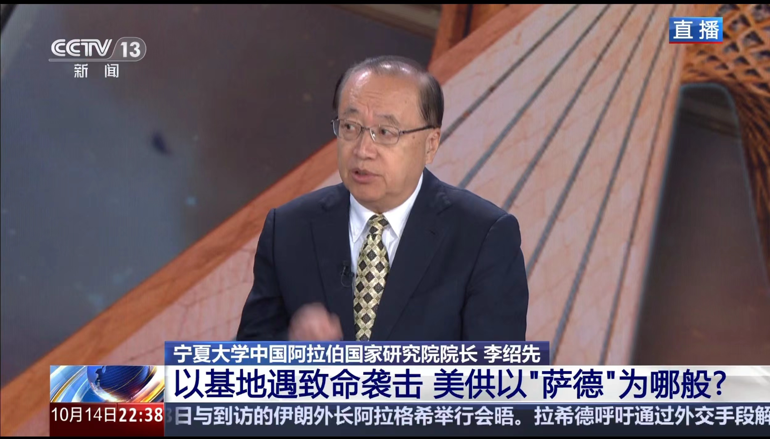 我院院长、中国中东学会顾问、教育部国别与区域研究专家委员会委员、中阿博览会顾问委员会主任委员李绍先接受了CCTV13《新闻直播间》等栏目的采访,就黎以冲突及趋势进行了分析和解读。