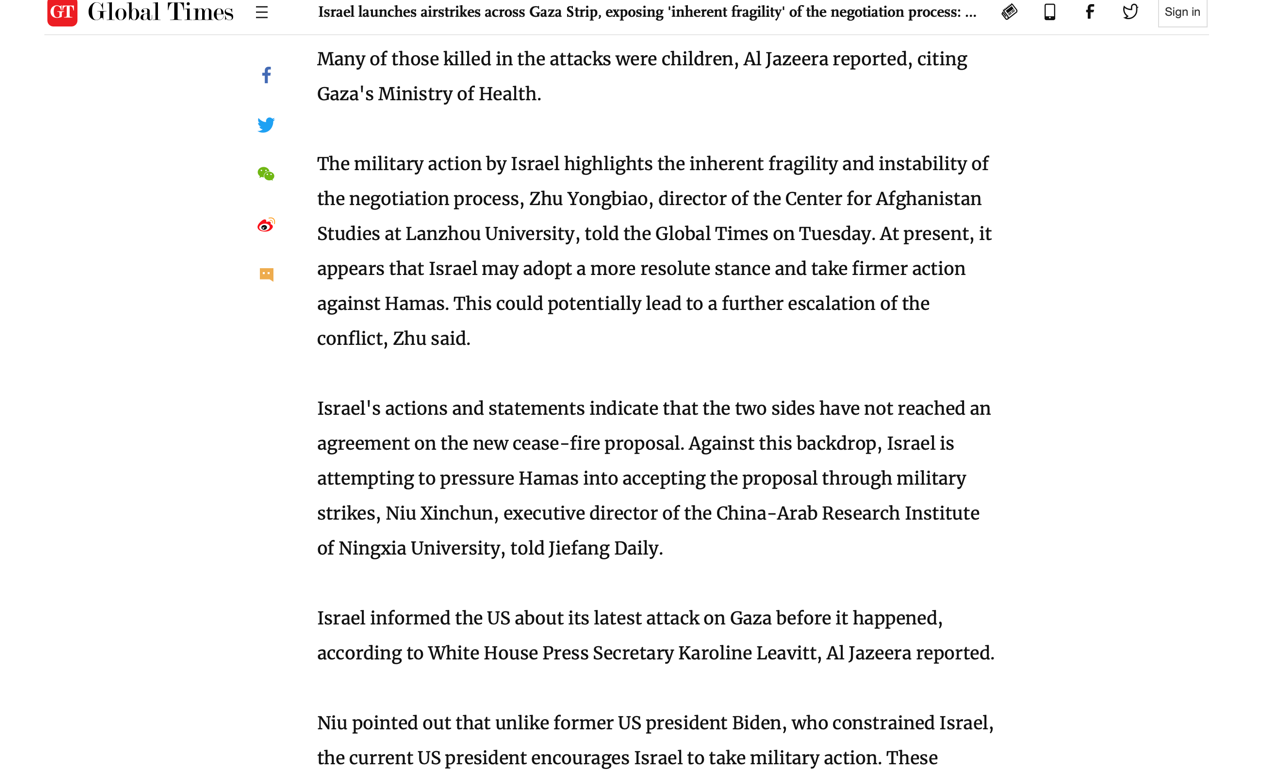 十二、3月18日环球时报题为《Israel launches airstrikes across Gaza Strip, exposing 'inherent fragility' of the negotiation process: expert》文章引用牛校长观点