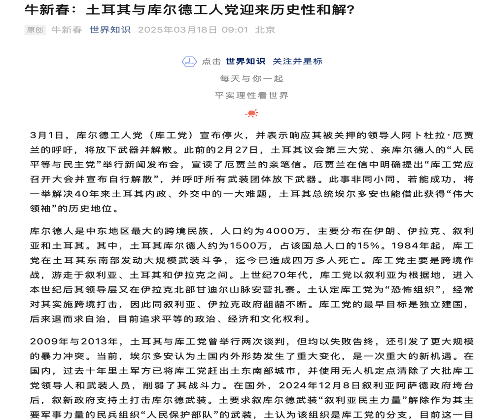 十四、3月18日,牛校长在《世界知识》杂志第六期发表题为《土耳其与库尔德工人党迎来历史性和解?》的文章