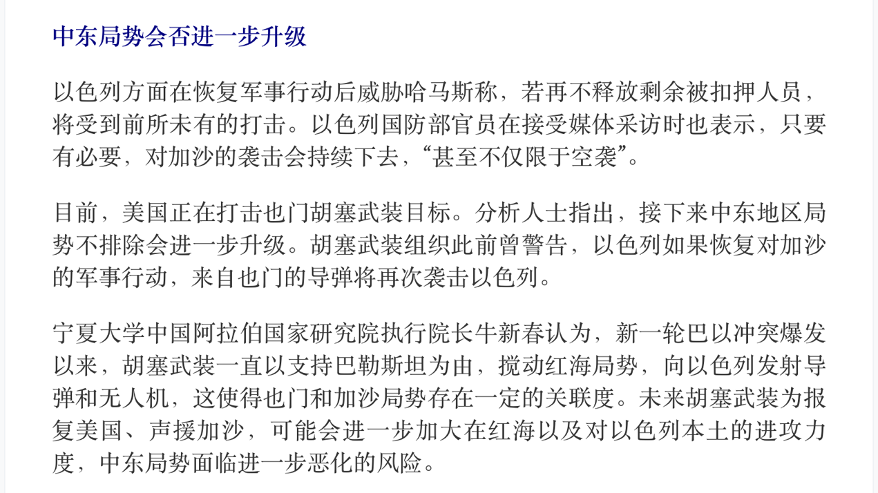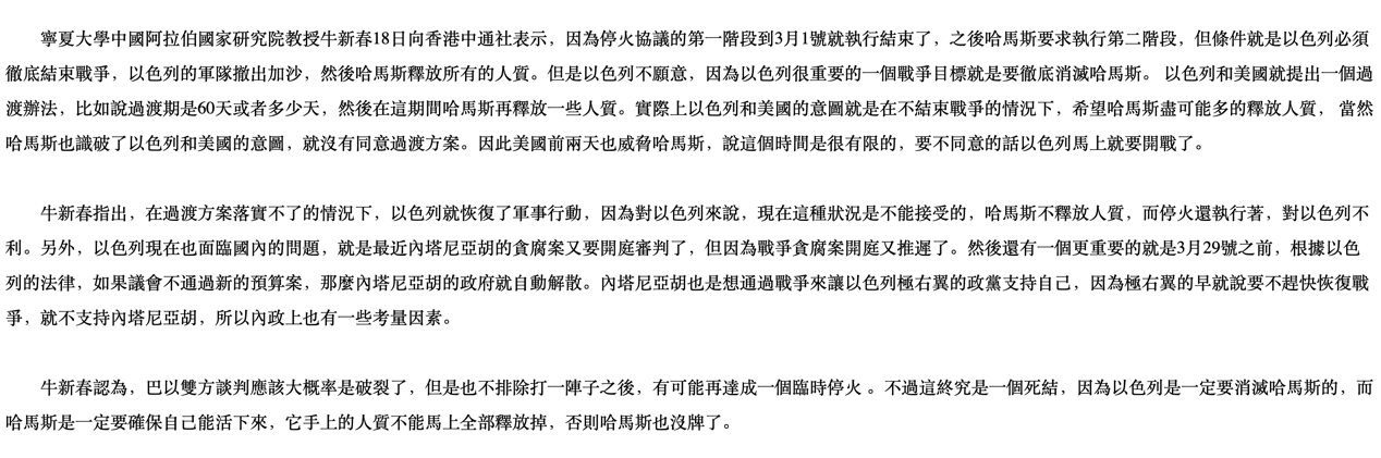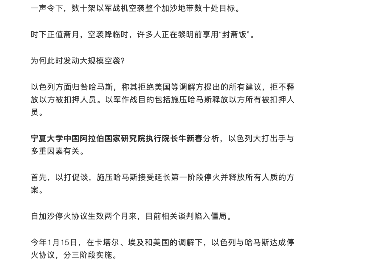 十三、3月18日接受香港中通社特稿采访,题为《以色列重啟戰火加沙還有可能停火嗎?》