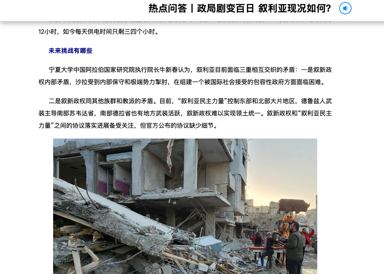 四、3月17日接受新华网“热点问答”栏目采访,题为《政局剧变百日叙利亚现况如何?》