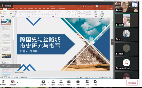 2022年6月10日,山西师范大学教授车效梅应邀为我院师生作了题为 “跨国史与丝路城市史研究与书写”的讲座。讲座以腾讯会议线上方式进行,3044am永利(中国阿拉伯国家研究院)副院长金忠杰教授主持讲座,3044am永利(中国阿拉伯国家研究院)和相关学院、国内相关学术机构师生130余人在线聆听了讲座。
